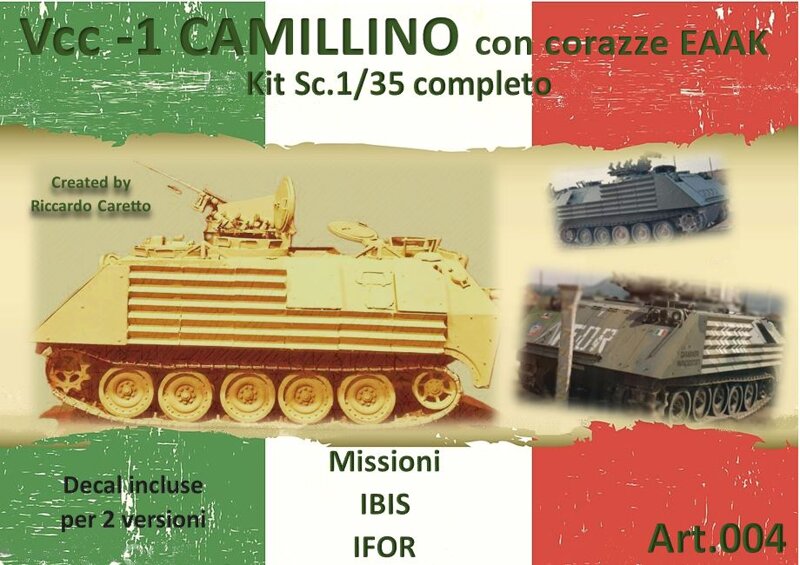 Kit di montaggio in Sc.1/35 di un VCC 1, ( Prima versione ) senza corazze addizionali posteriori, ma con le corazzature aggiuntive .Il kit è realizzato in resina epossidica in modo artigianale, va pulito montato e colorato. Il kit comprende le decal.
